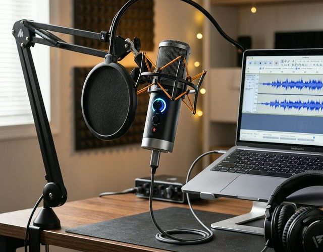Maono USB condenser microphone setup for podcasting with boom arm, pop filter, and headphones